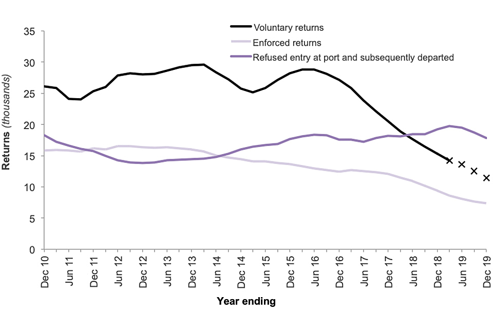 - ‘Voluntary returns’ include ‘verified returns’ which are subject to upward revision (particularly for the last 12 months) as in some cases it can take time to identify people who have left the UK without informing the Home Office. Provisional data are denoted with an ‘X’ in the chart.