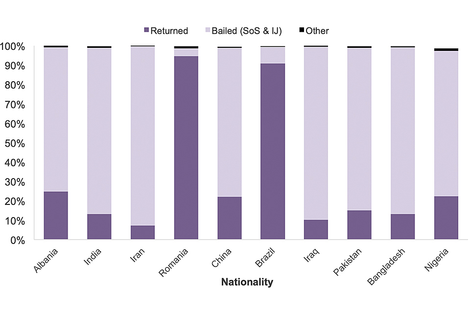 Among the top 10 nationalities leaving detention in 2019, there were differences in whether people were granted bail or returned from the UK. For example, 92% (1,587) of Iranian and 89% (1,086) of Iraqi nationals were granted bail. In contrast, 95% (1,422) of Romanians and 91% (1,244) of Brazilians were returned from the UK. Changes in the proportion of people returned who receive bail or who are returned from the UK will therefore partly reflect changes in the mix of nationalities who are detained.