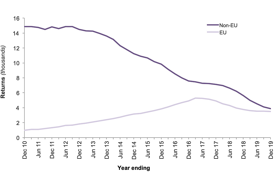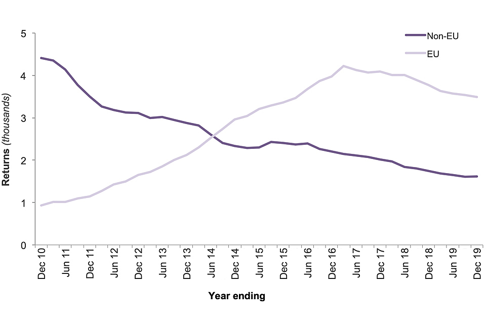 The number of enforced returns of non-EU nationals has fallen over the last 10 years from around 14,800 in 2010, to around 3,900 in 2019. In contrast, returns of EU nationals increased, reaching a peak of 5,275 in the year ending March 2017, but has fallen since then to 3,498 in 2019.