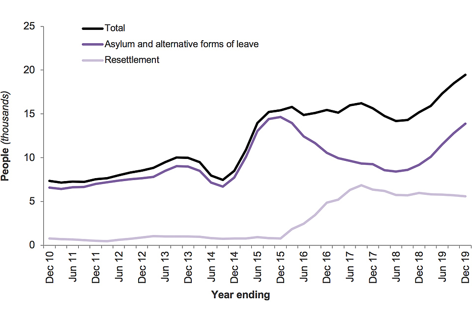 The UK offered protection – in the form of asylum, humanitarian protection, alternative forms of leave and resettlement – to 20,703 people in 2019, up 30% compared with the previous year and similar to levels seen in 2003. This included: