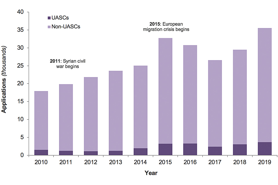 There were 35,566 asylum applications (main applicants only) in the UK in 2019, 21% more than the previous year, but lower than the recent peak in year ending June 2016 (36,546). Unaccompanied asylum-seeking children (UASCs) accounted for 10% of total asylum applications in the latest year.