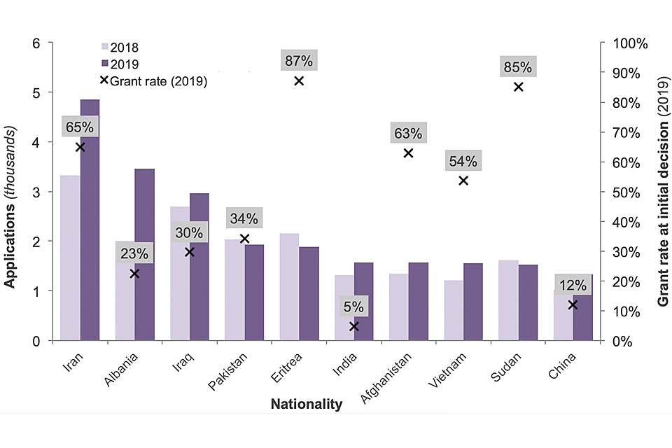 - The percentages in the chart are the grant rate at initial decision for each nationality in the most recent year.