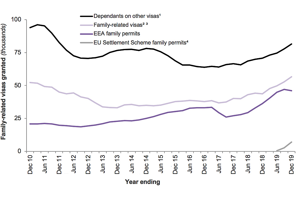 Data in this section refer to the number of Entry clearance visas granted for family reasons (including those issued to dependants of those travelling on other types of visas, excluding Visitor visas), EEA Family permits and EU Settlement Scheme family permits granted, within the period. If an individual was granted a visa more than once in a given period, this has been counted as multiple grants in the statistics. If an individual entered the UK multiple times within the period for which a visa was valid, this has been counted as one grant in the visa statistics.