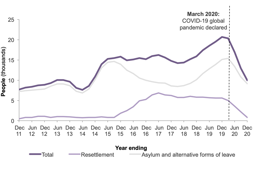 Figure 1: People granted1 asylum, alternative forms of leave2, and resettlement3 in the UK, years ending December 2011 to December 20204,5