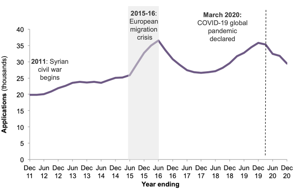 Applications rose slowly from 2011 to 2015, and more rapidly in the European Migration crisis (2015-16). Applications fell after the crisis but by the end of 2019 had returned to similar levels. Levels have fallen since March due to COVID-19.