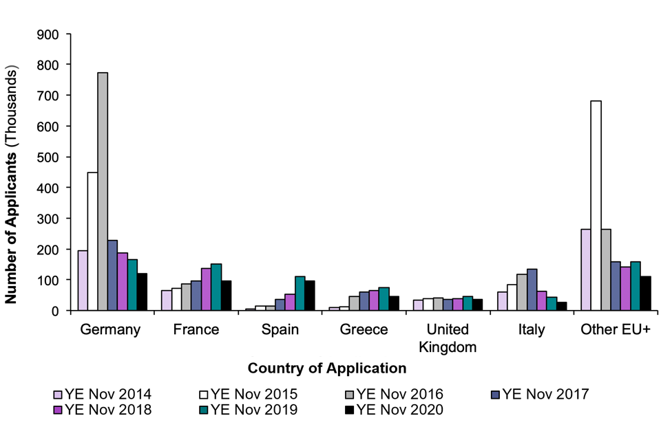 Figure 4: The number of asylum applicants to the top five countries1 in the EU+ and the UK for the years ending November 2014 to November 20202,3
