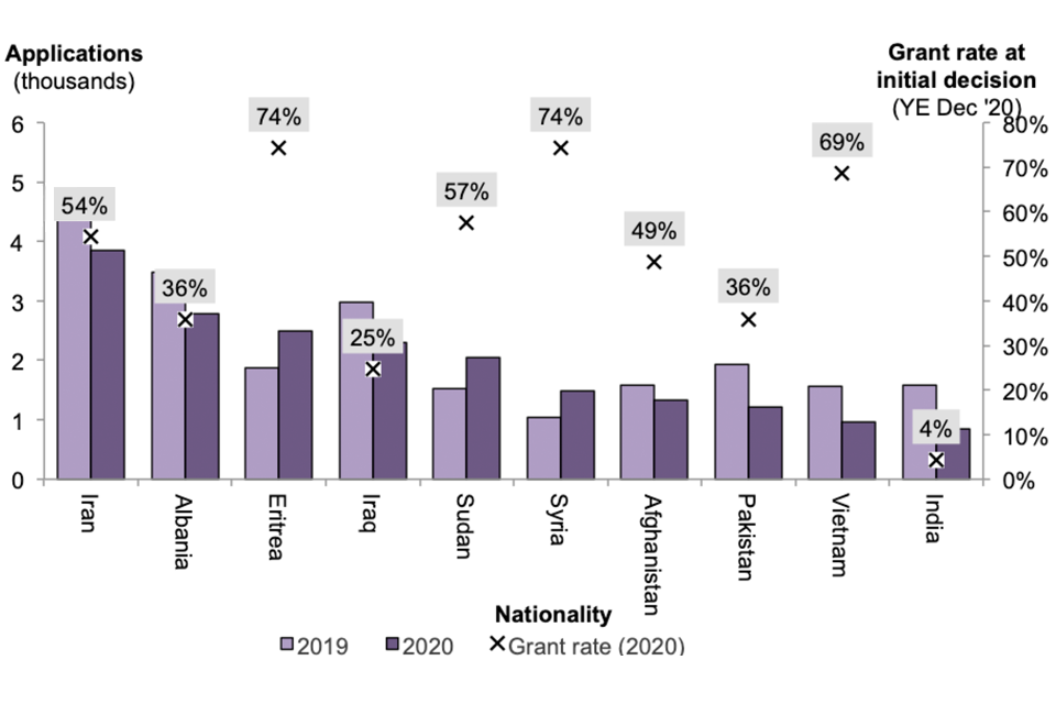 - The percentages in the chart are the grant rate at initial decision for each nationality in the most recent year.