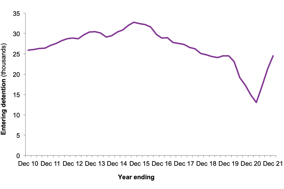 There has been a general downward trend in the number of people entering detention since the peak in 2015, as shown in Figure 1, when over 32,000 people entered detention.