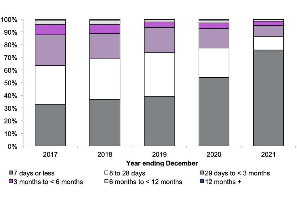 Figure 3: People leaving immigration detention, by length of detention1,2, 2017 to 2021