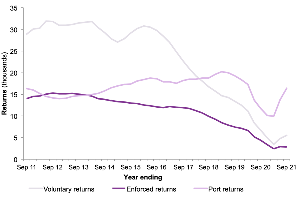 In the year ending September 2021, there were 5,537 voluntary returns, 17% fewer than last year and 56% lower than pre-pandemic in 2019. This reduction continues a downward trend since the peak in 2015.