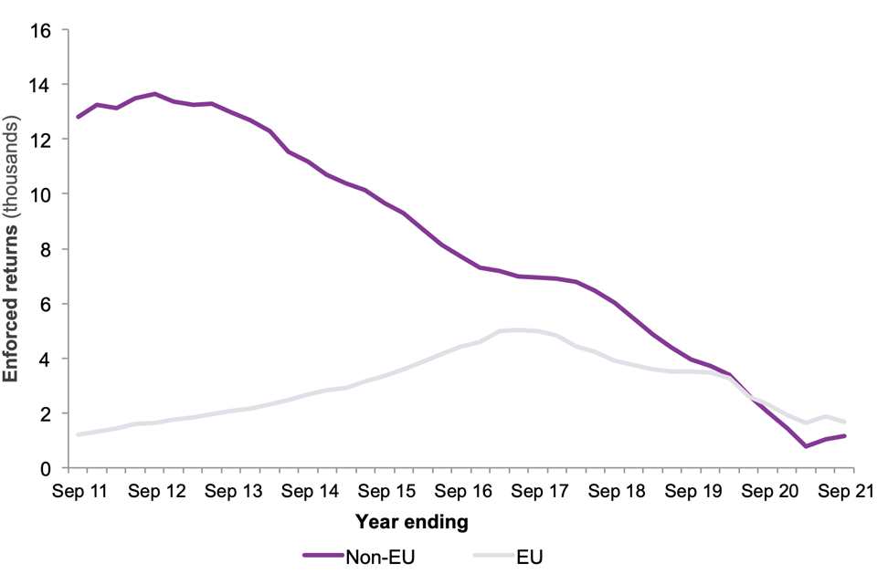 Figure 6: Enforced returns from the UK, for EU and non-EU nationals, year ending September 2011 to year ending September 2021