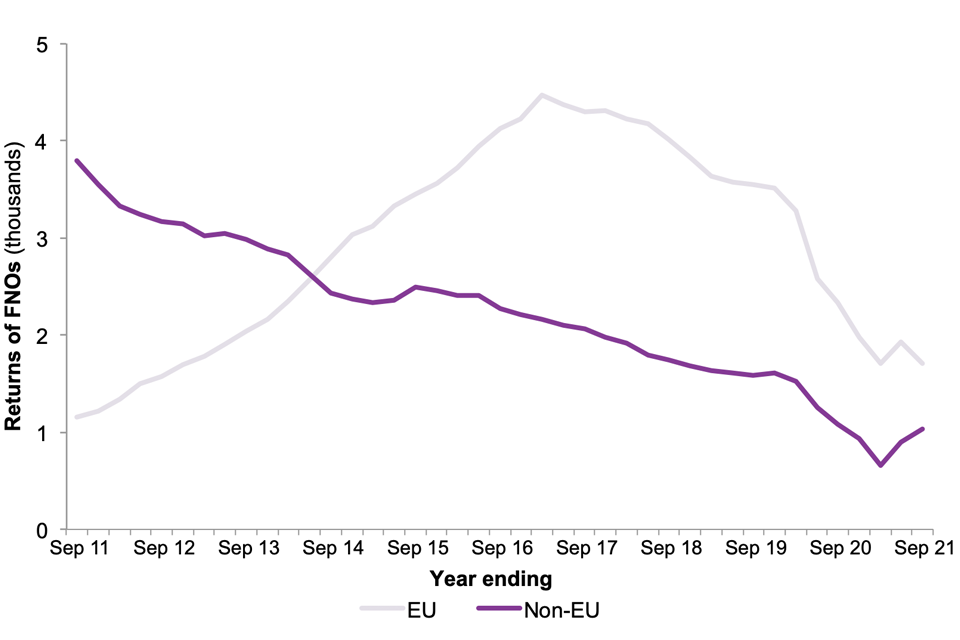 Figure 7: Returns of FNOs1 from the UK, for EU and non-EU nationals, year ending September 2011 to year ending September 2021