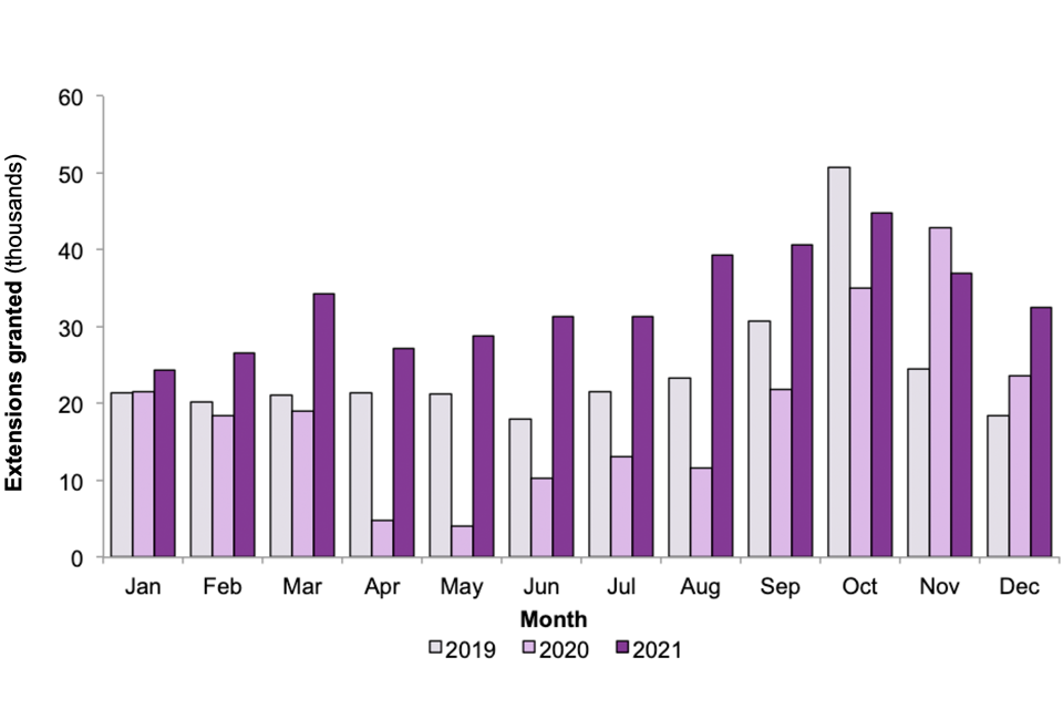 Figure 1: Extensions of leave granted1 in the UK, by month, 2019, 2020 and 2021