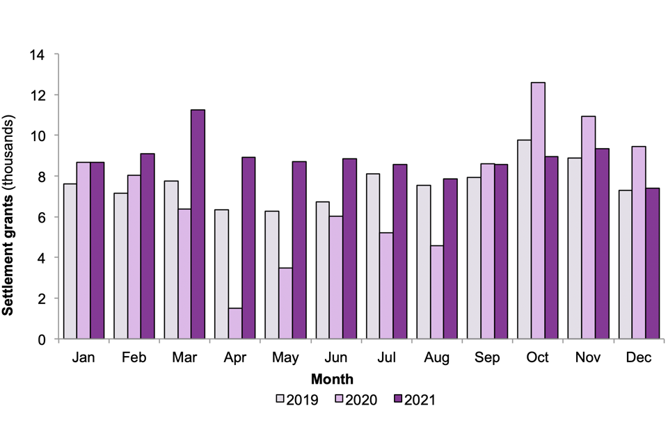 Figure 3: Grants of settlement in the UK, by month, 2019, 2020 and 2021