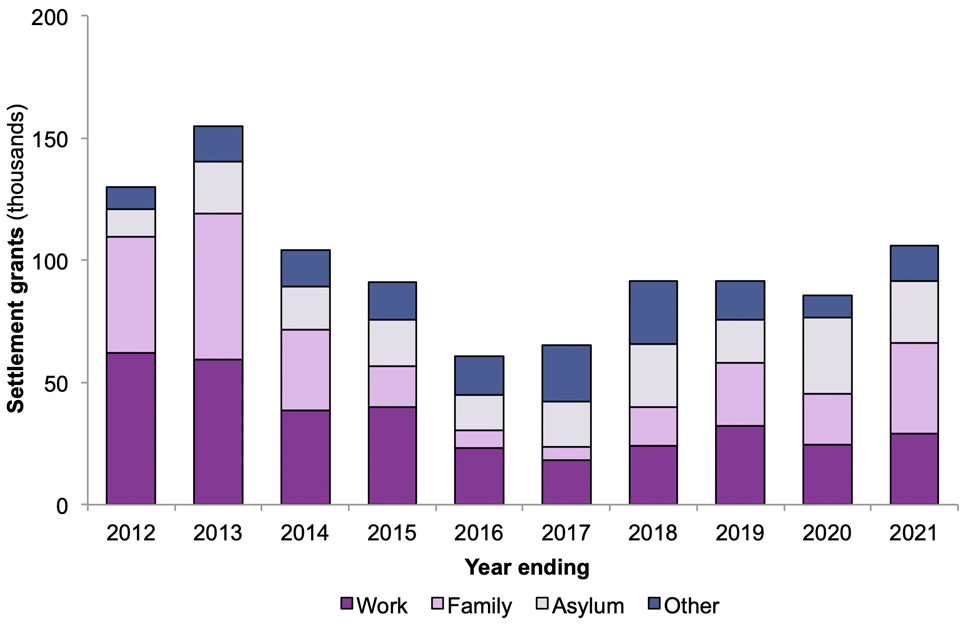 - Settlement by skilled (formerly Tier 2) workers, which increased by 27% since 2020 to 21,605, though this is still a reduction of 6% when compared to 2019.
