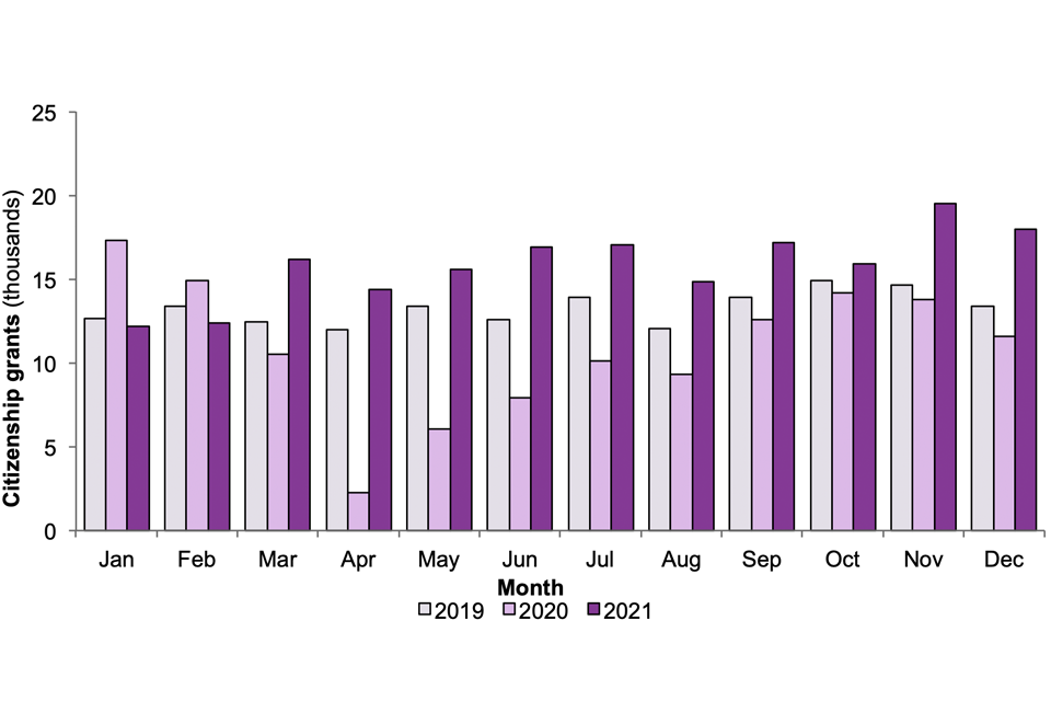 Figure 5: Grants of British citizenship, by month, 2019, 2020 and 2021
