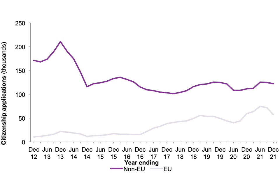 Figure 4: Number of applications for British citizenship from EU and non-EU nationals1,2, years ending December 2012 to December 2021