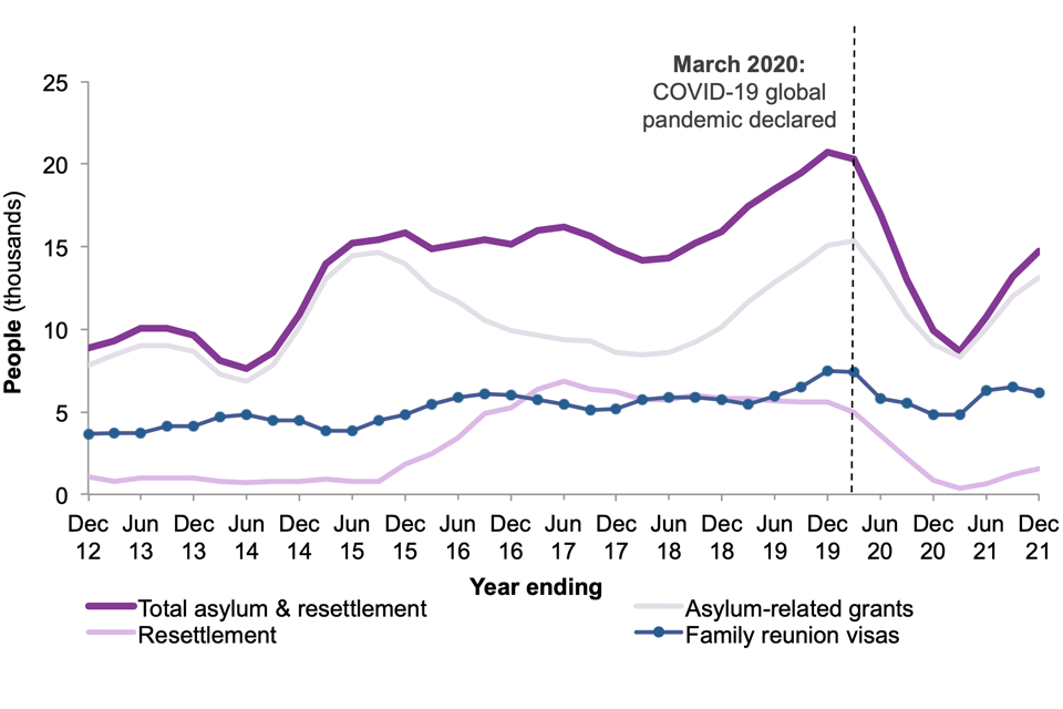 Figure 1: People granted asylum-related protection, resettlement and family reunion visas in the UK, years ending December 2012 to December 2021 1,2,3,4