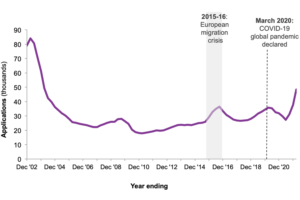 Figure 2: Asylum applications lodged in the UK, years ending December 2002 to December 2021 1