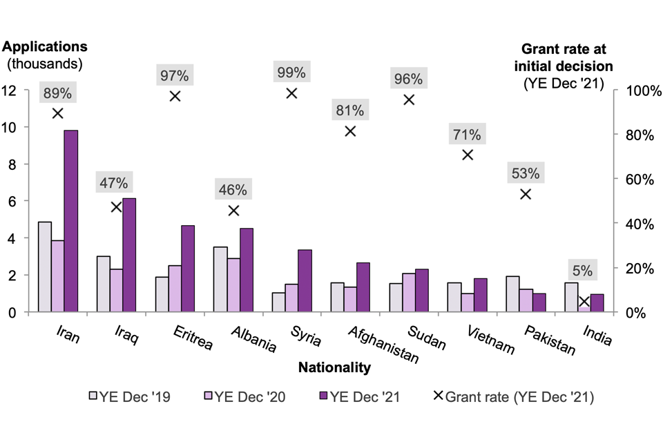 Iran was the top nationality claiming asylum in the UK in 2021 (9,800 applications), as it has been in every year since 2016.
