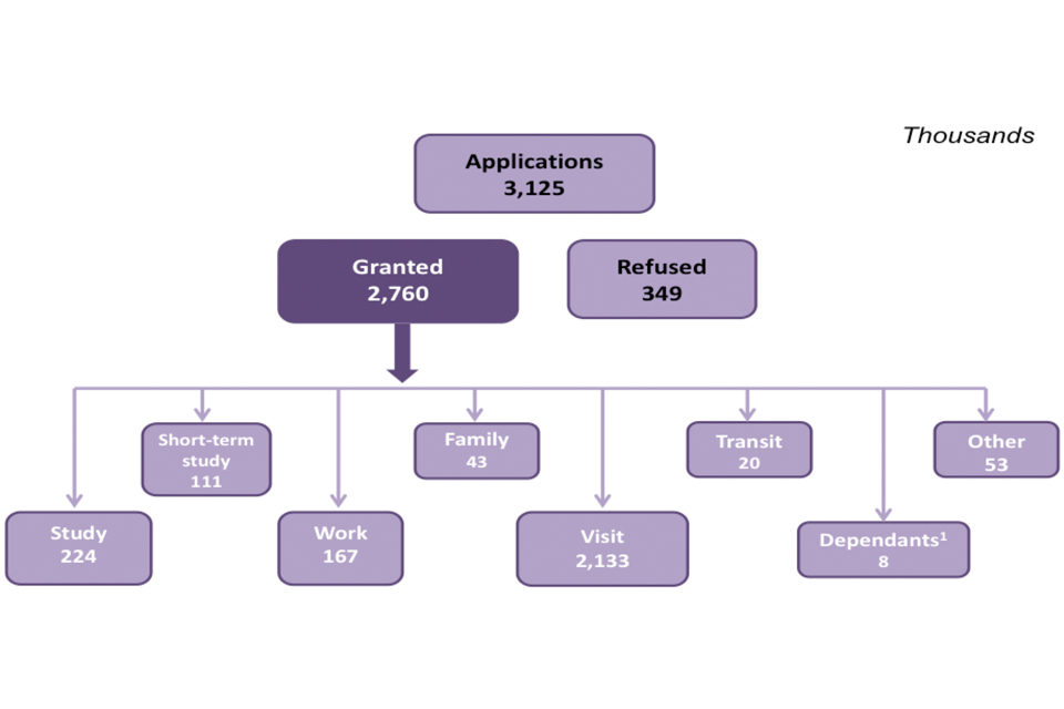 Further data on Entry clearance visas and sponsored visa applications for the Work, Study and Family routes (described further in the Work topic, Study topic and Family topic) can be found in the following tables: