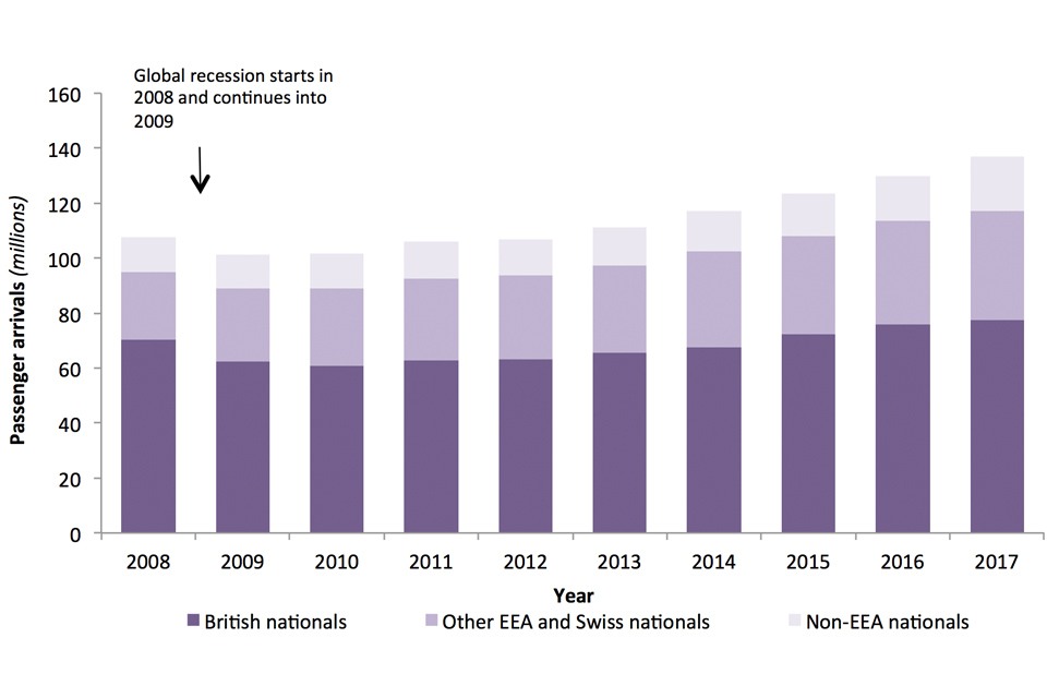 There were 139.2 million passenger arrivals in the year ending June 2018, including returning UK residents, an increase of 4.7 million compared to the previous year and a record number. This increase was divided between: