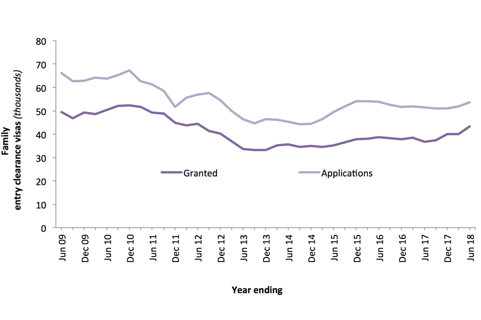 There were 141,416 visas granted for family reasons in the year ending June 2018, 9% more than in the previous year. This included:
