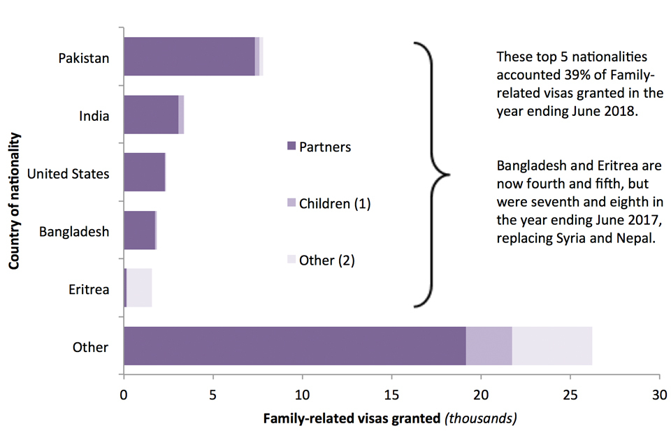 Nationals of Pakistan were issued with the highest number of family-related visas in the year ending June 2018. The top 5 nationalities accounted for almost two-fifths (39%) of family-related visas granted.