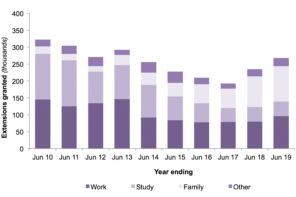 A more detailed commentary on extensions by previous category can be found in ‘Immigration statistics, year ending March 2019’.
