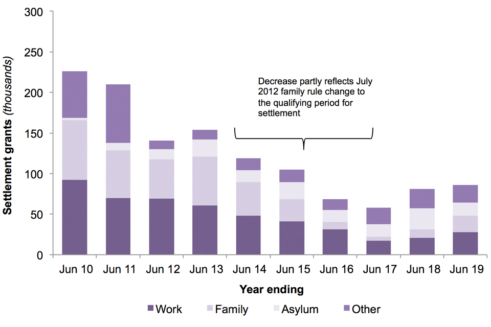 There were 89,406 decisions on applications for settlement in the UK in the year ending June 2019, 4% more than in the previous year. Of these, 85,931 (96%) resulted in a grant. There were increases in settlement for: