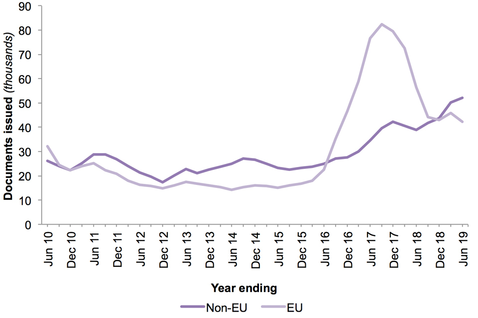 Although documents issued to EU nationals have fallen since the peak of 151,521 in Q3 2017, current levels (69,594) remain considerably higher than prior to the EU referendum.