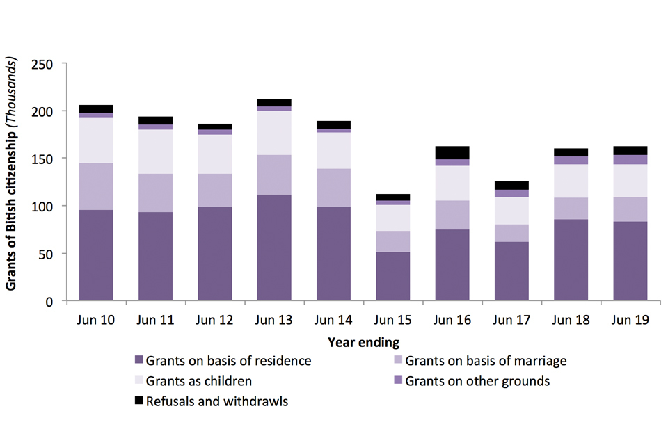 There were 153,462 grants of British citizenship in the year ending June 2019, similar to the previous year. This remains below the peak seen in 2013 after which application and grant numbers fell.