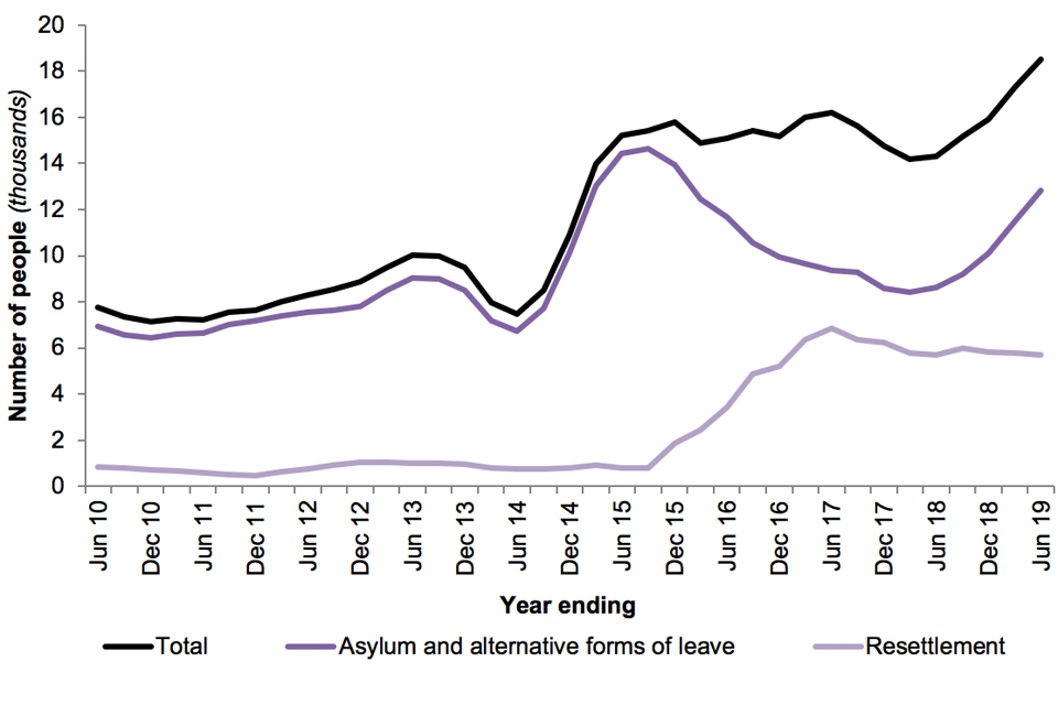 The UK gave protection – in the form of grants of asylum, humanitarian protection, alternative forms of leave and resettlement – to 18,519 people in the year ending June 2019 (up 29% compared with the previous year). Of these, 40% (or 7,351) were children. This was the highest number of people granted protection in the UK over a one-year period since the year ending September 2003.