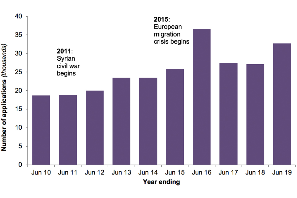 There were 32,693 asylum applications in the UK (main applicants only) in the year ending June 2019, 21% more than the previous year but below the level seen in the year ending June 2016 during the European migration crisis.