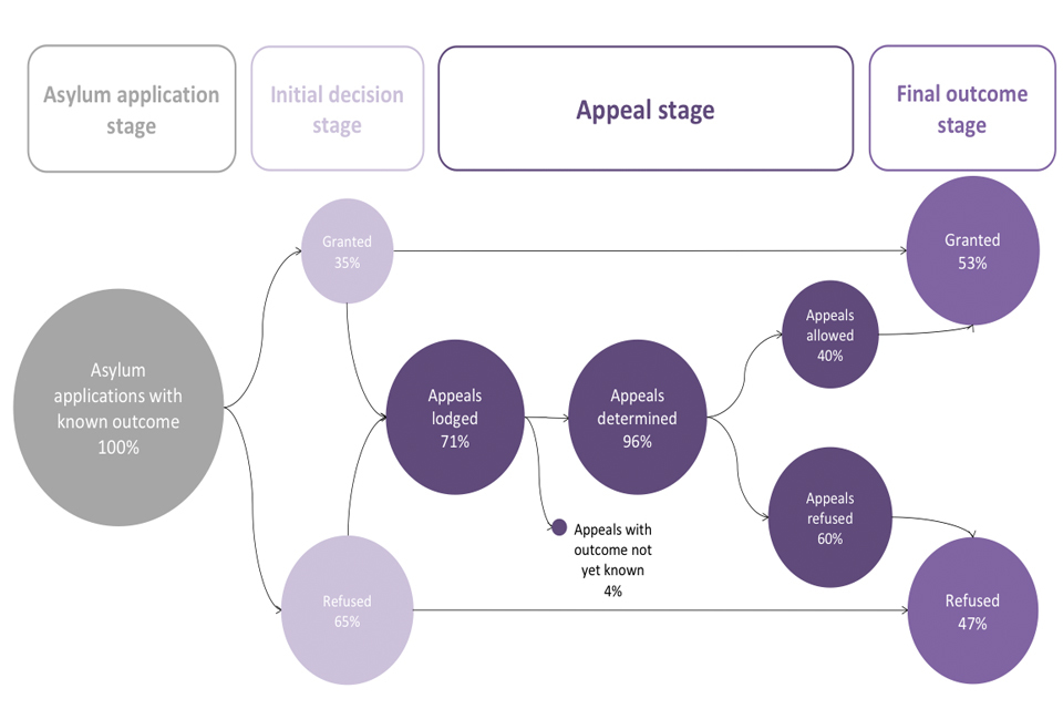 The most recent data report on the initial decisions made on asylum applications by the Home Office. However, some decisions will be challenged at the HM Courts and Tribunals Service (HMCTS), an executive agency of the Ministry of Justice, which considers appeals against the asylum decisions made by the Home Office.