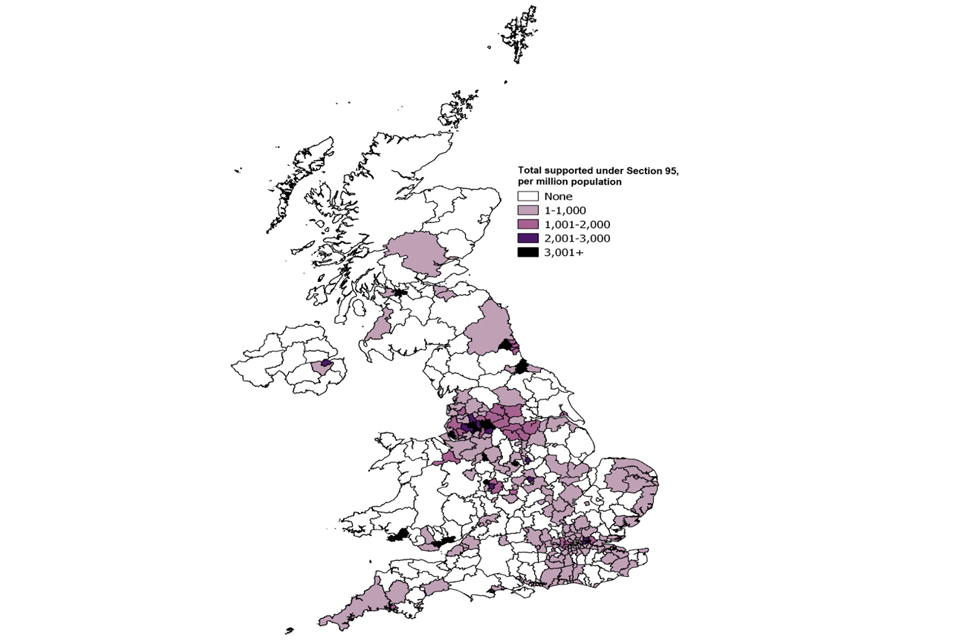 Section 95 support is provided to destitute asylum seekers until their claim is finally determined, which may encompass either accommodation or subsistence, or both. ‘Invalid applications for support and support type not yet known’ are cases that have been deemed invalid or which have not yet been assessed.