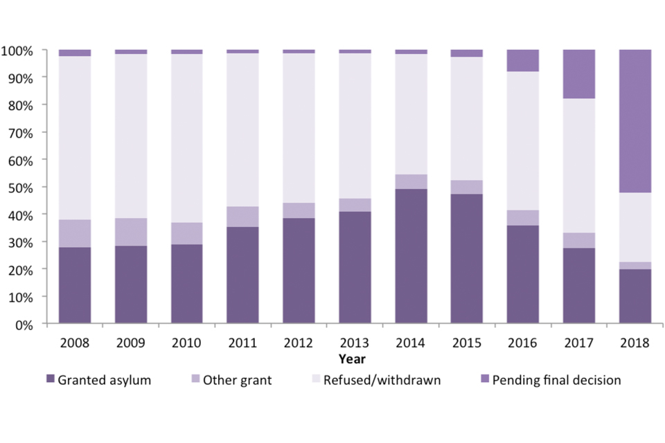 The chart shows the latest outcome of asylum applications made between 2008 and 2018, as at May 2019.