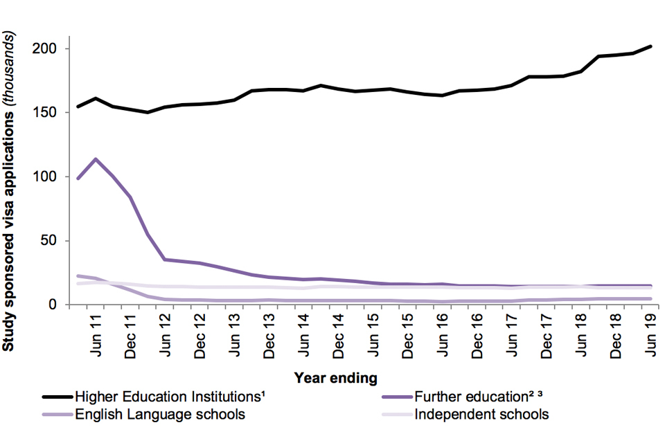 The majority (85%) of those coming to the UK on a sponsored study visa come to study at Higher Education (university) institutions. In the year ending June 2019, Sponsored study visa applications for the Higher Education (university) sector increased by 11% to 201,919, the highest level on record.