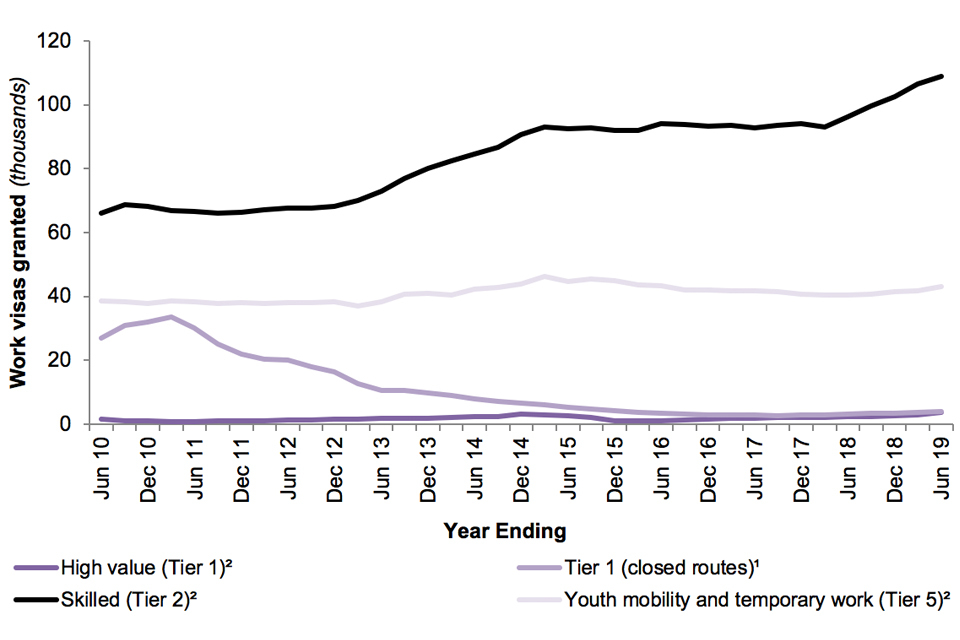 There were 185,465 work-related visas granted in the year ending June 2019, 11% higher than the previous year, and the highest level since the year ending March 2008, around the period when a new Immigration system (also known as ‘the points-based system’ (PBS)) was introduced. The majority (69%) of the increase in the latest year can be accounted for by Skilled (Tier 2) work visas, which increased by 13% to 108,890. The Skilled (Tier 2) category accounts for 59% of work-related visas granted.