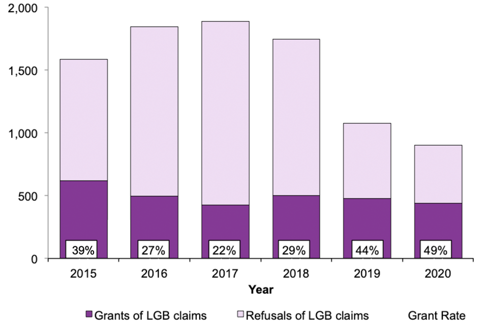 The grant rate decreased between 2015 and 2017, from 39% to 22%, however since 2017 the grant rate has increased, and almost half (49%) of LGB asylum applications were granted at initial decision in 2020. The recent increase in grant rate for LGB applications to some extent reflects an increase in overall grant rate in all asylum decisions over the last couple of years. The overall grant rate can vary for a number of reasons, including the protection needs of those who claim asylum in the UK, along with changes in operational or policy decisions.