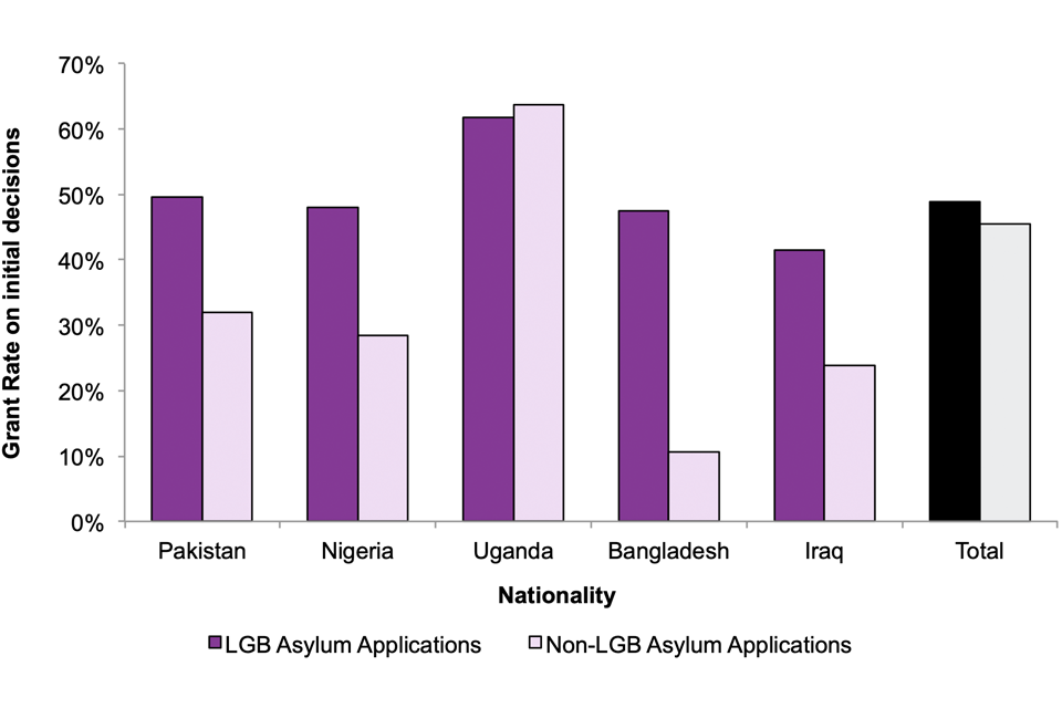 Overall, the grant rate for LGB claims does not differ greatly from the overall grant rate for non-LGB asylum applications, and other aspects of the application can be more influential factors than any sexual orientation element to the application.