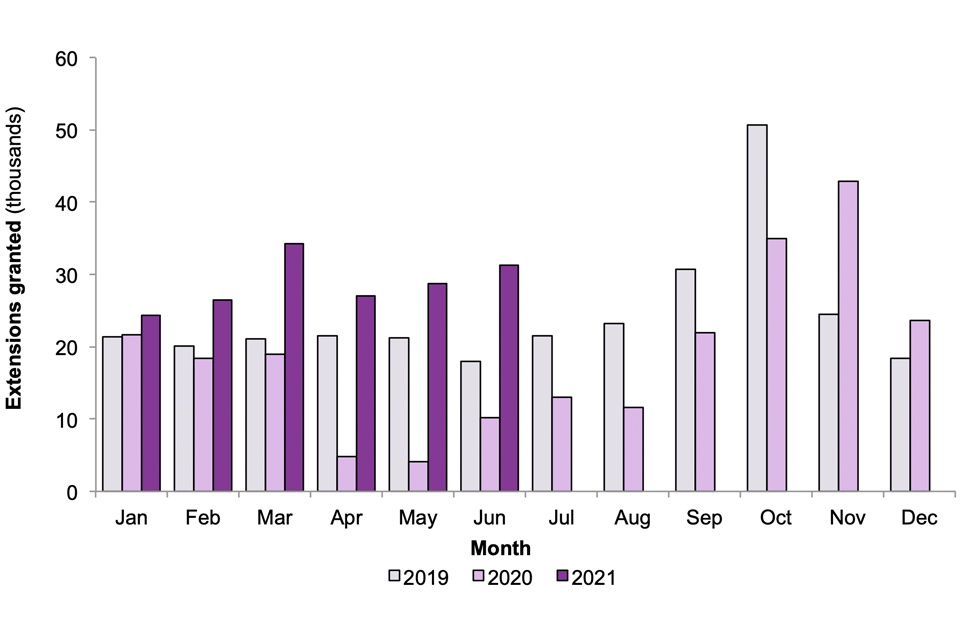 Figure 1: Extensions of leave granted1 in the UK, by month, 2019, 2020 and 2021