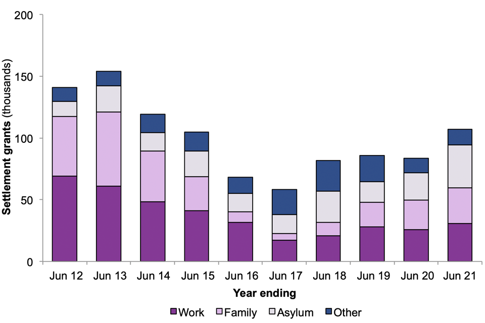 There were 108,773 decisions on applications for settlement in the UK in the year ending June 2021, 26% more than in the year ending June 2020. Of these, 106,876 (98%) resulted in a grant.