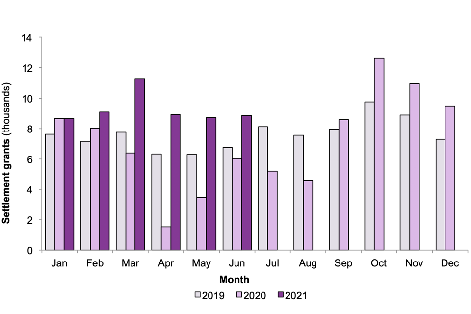 From September 2020, grants of settlement were higher compared with the same month the previous year. Grants in the period January to June 2021 were 63% higher than in the same period in 2020 and 32% higher than in the same period in 2019.