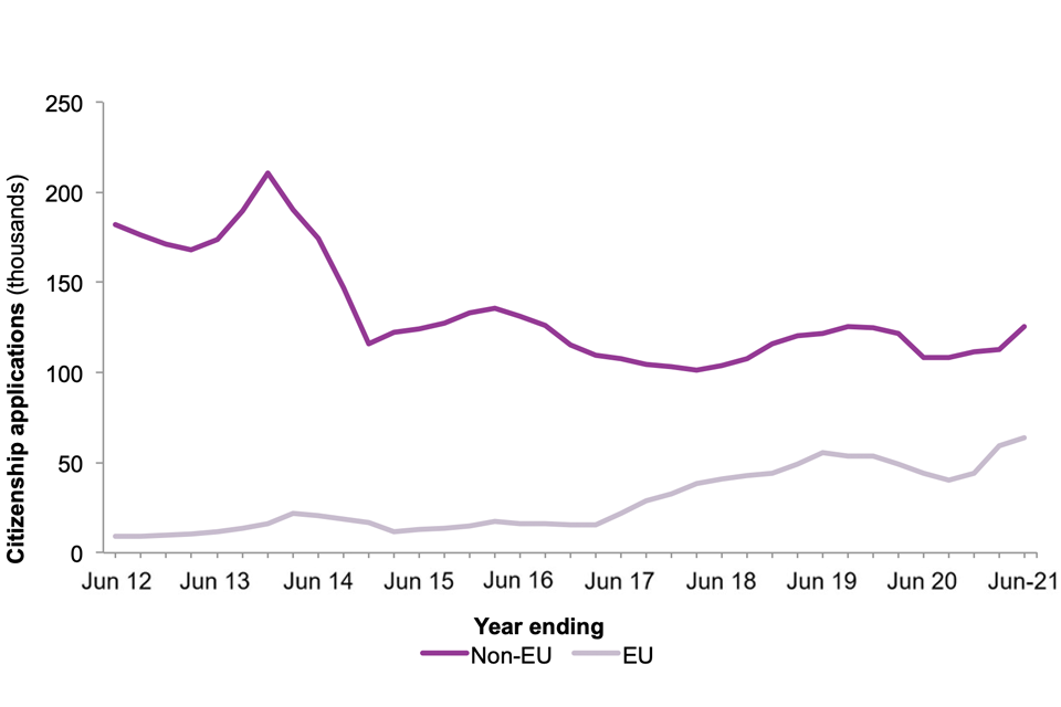 Applications made by non-EU nationals rose by 16% in the year ending June 2021 to 125,793, although the trend in non-EU citizenship applications has been broadly stable since 2014.
