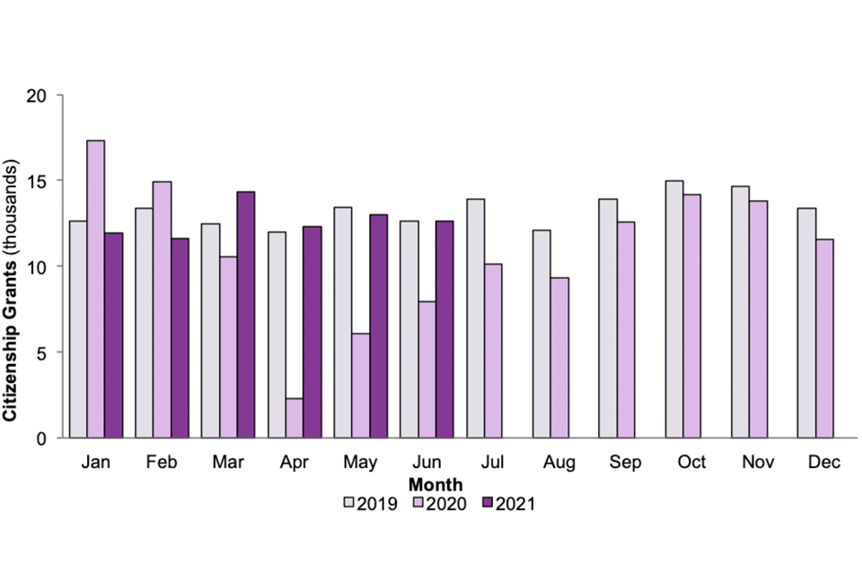 Figure 5: Grants of British citizenship, by month, 2019, 2020 and 2021