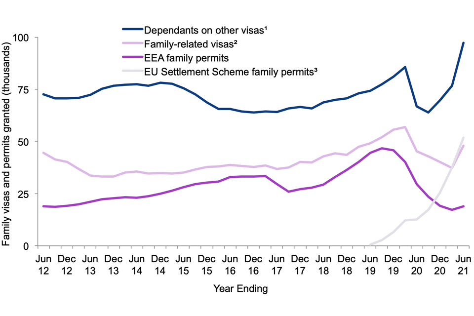Data in this section refer to the number of Entry clearance visas granted for family reasons (including those issued to dependants of those travelling on other types of visas), EEA family permits and EU Settlement Scheme family permits granted, within the period. If an individual was granted a visa more than once in a given period, this has been counted as multiple grants in the statistics. If an individual entered the UK multiple times within the period for which a visa was valid, this has been counted as one grant in the visa statistics.