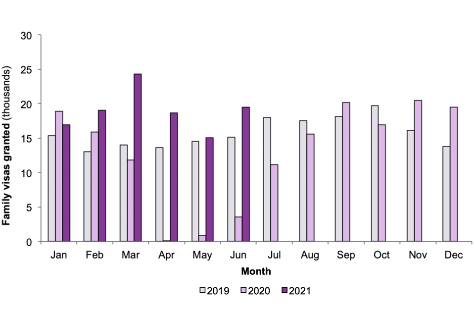 There were 215,746 visas and permits granted for family reasons in the year ending June 2021, 40% more than the year ending June 2020 largely due to increases in dependants of people coming on work or study visas. A sharp fall in grants was seen in April to June 2020 due to the impacts of the COVID-19 pandemic. However, the number of grants of visas and permits has begun to recover to pre-pandemic levels.