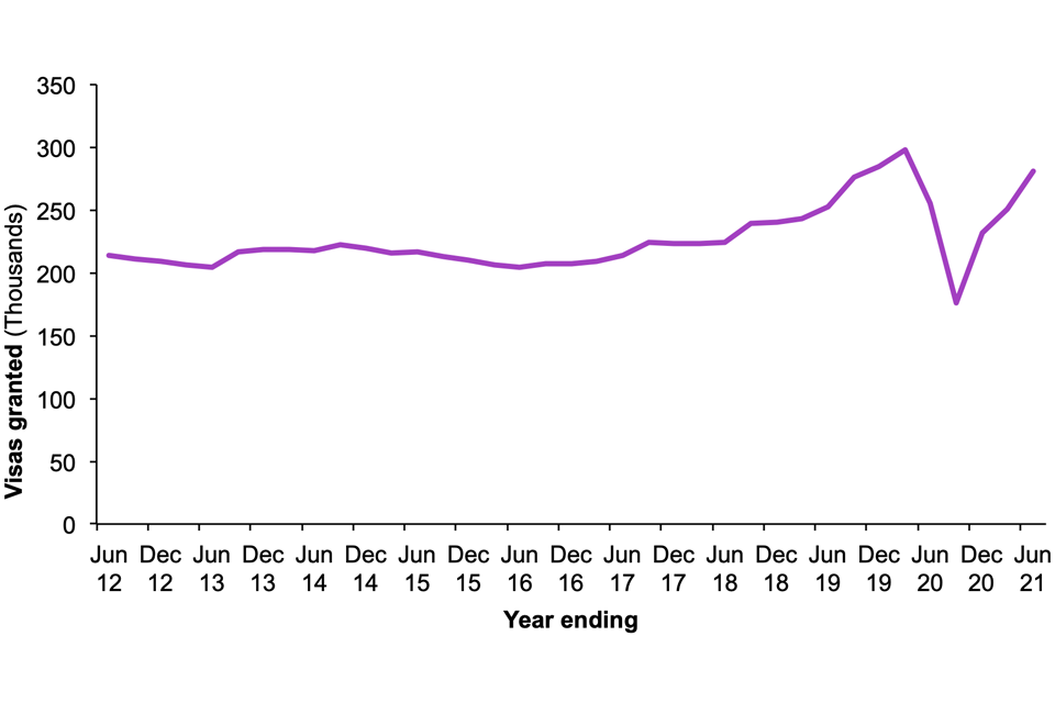 Sponsored study grants remained broadly level at around 225,000 in each year from 2012 to 2018. From the year ending September 2018 to the year ending March 2020, sponsored study grants increased sharply to a high of almost 300,000. This was followed by a sharp decrease due to COVID-19, with the year ending September 2020 showing the lowest number of sponsored study grants on record. However, the numbers of students granted a visa have since recovered, and now sit at just over 280,000 in the year ending June 2021.