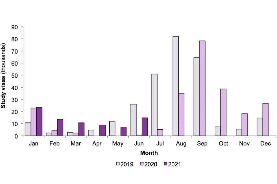 In the year ending June 2021, there were 281,008 Sponsored study visas granted (including dependants), 10% (25,232) more than the previous year and 11% (28,073) higher than the year ending June 2019. Of the 281,008 sponsored visas granted, 165,559 (59%) were under Tier 4 rules and 115,449 (41%) were under the new Student and Child Student routes introduced on the 5th October 2020.